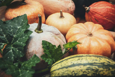 Many Different kinds of pumpkins close up, selective focus