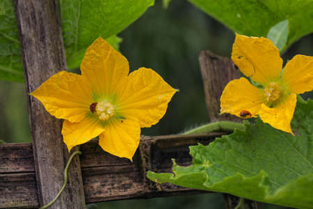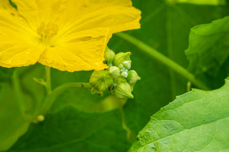 beauty yellow flower buds and star shape cucumber organic healthy vegetable in botany garden.