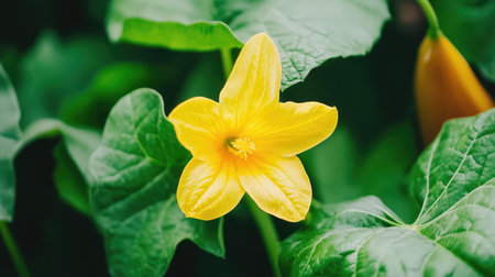 A fresh yellow cucumber flower blooming among green leaves, highlighting seasonal plant growth