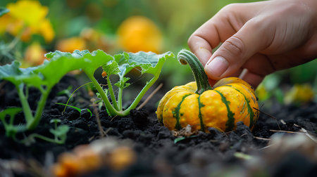 A hand touching a small pumpkin in the vegetable garden