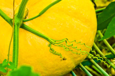 pumpkin on the plant in the garden, close-up
