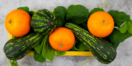 autumn harvest. Bright orange and green pumpkins in a wooden box on green leaves and a concrete gray background. The concept of a new harvest and Halloween decoration