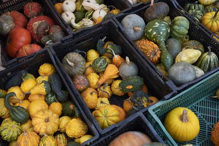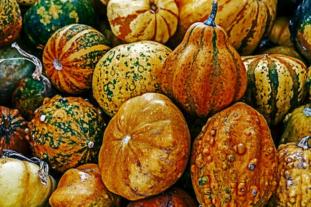Autumn harvest colorful pumpkins and squashes in different varieties at farm market or seasonal festival. Background of decorative fall and winter squashes