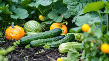 A vegetable plot with a mix of summer vegetables, including cucumbers, zucchinis, and squash.