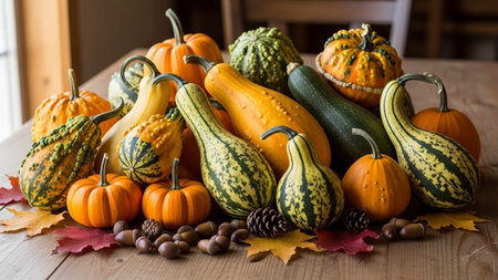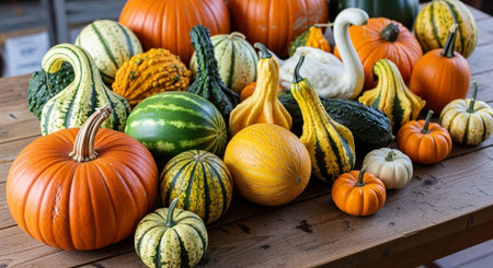 Thanksgiving and Harvest Festival. variety of pumpkins, their vibrant colors and textures ranging from smooth orange to warty green, representing the diversity of nature's gifts.