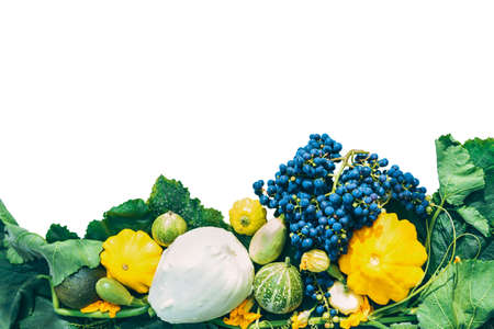 Autumn harvest of pumpkins and grapes on a white background. Copy space.