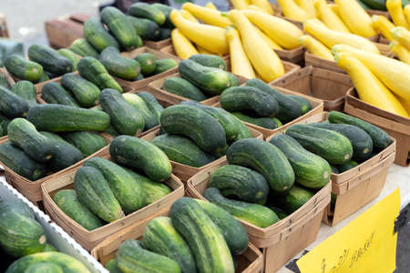 Close up fresh new green and yellow zucchini on retail display of farmers market, high angle view