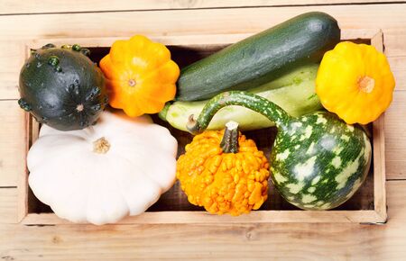 Harvest colored different vegetables gourds pumpkin, zucchini, squash in a wooden box on gray stone background. Top view Flat lay.