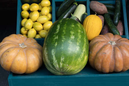 two ripe large pumpkins next to a large watermelon on sales shelf in front of other fruits and vegetables such as sugar beets lemons zucchini and honeydew melon