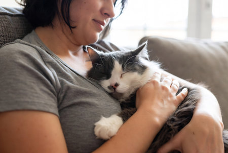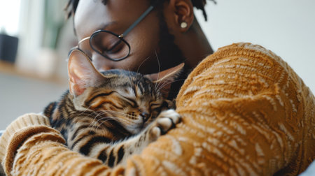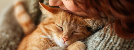 Woman Cuddling Sleeping Cat in Cozy Wool Sweater