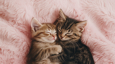 Two adorable kittens peacefully snuggle together on a soft pink blanket, capturing a lovely moment of warmth, comfort, and friendship in their playful world.