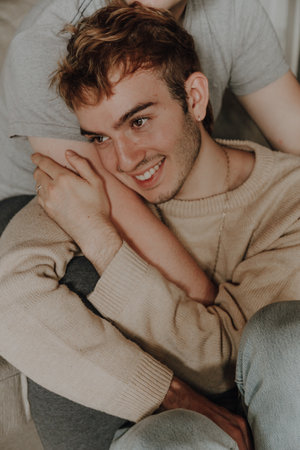 Passionate homosexual couple laying at the bed while spending romantic weekend