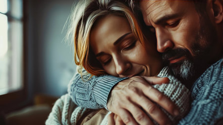 Two individuals embrace tightly in a moment of silent communication, expressing profound emotions without words in a softly blurred environment.