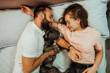 Happy Couple Man and Woman Laying on the Bed with Their Dog, French Bulldog Sweetly Sleeping with Humans
