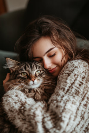 A young woman with long hair smiles gently as she embraces her fluffy tabby cat, creating an atmosphere of warmth and companionship in a cozy living room.