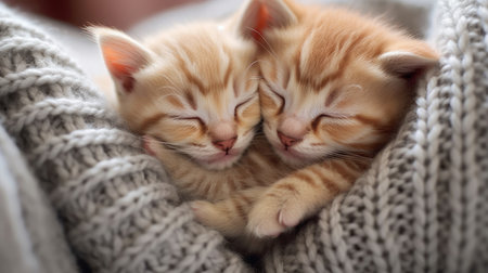 Two cats snuggling together. Two adorable kittens sleeping together close up. Generative AI illustration