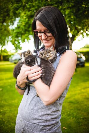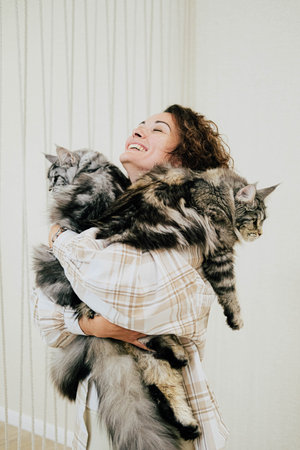 Beautiful woman with curly hair holds two big gray cats in her hands. Two fluffy Maine Coons in the hands of a woman.