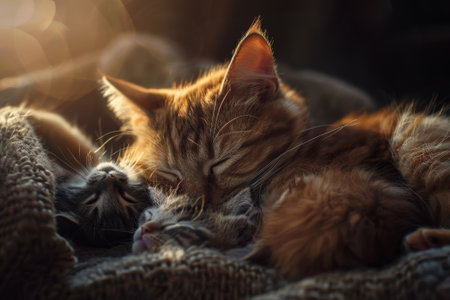Two cats with closed eyes are nestled closely together, displaying their soft fur and peaceful expressions, creating a warm atmosphere of love and connection, AI generated
