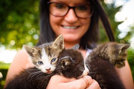 Two small newborn blind kittens lie in their hands. Kittens with short tails, Kurilian Bobtail breed.