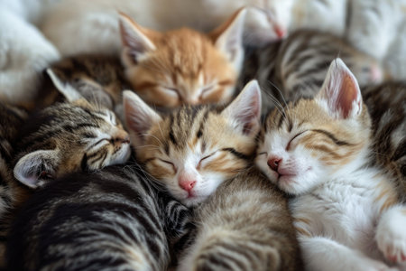 A group of small kittens peacefully sleeping together in a cozy pile, A group of playful kittens curled up for a nap, AI Generated