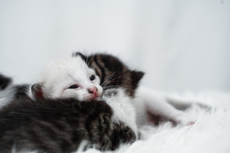 Three tiny kittens cuddle closely on a plush surface, their gentle expressions and varied fur markings evoking pure tranquility in a warm, cozy atmosphere.