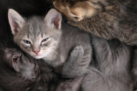 Adorable cats sleeping together and squeezing each other and squinting. Cats is all piled together having a nap. AI generated
