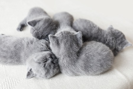 Group of cuddling little furry pussycats. One in the centre reversed. British shorthair.