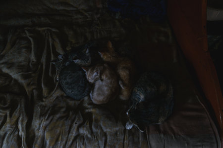 Beautiful photo of family of different colors kitty and mother cat on dark background in home