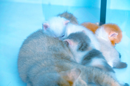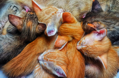 Newborn baby red cat drink their mothers milk. Cat feeding small cute ginger kitten. Domestic animal. Sleep and cozy nap time. Comfortable pets sleep at cozy home.
