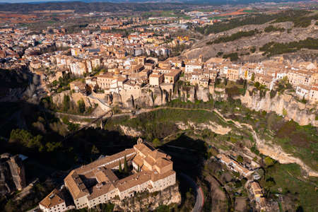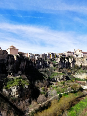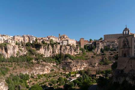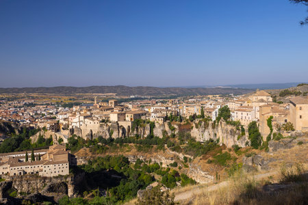 View of the Jucar Gorge and the town of Cuenca, Spain, a natural phenomenon caused by the erosion of the waters of this river on the limestone rock on which the city is built and which surrounds it