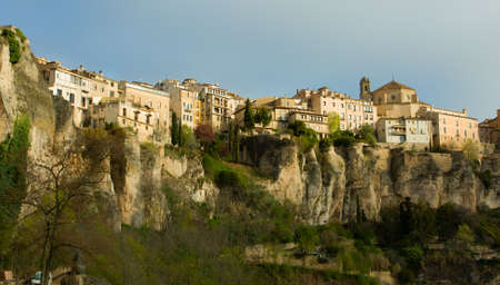 CUENCA, SPAIN - MARCH 28, 2015: Panoramic view of the Huecar Gorge with the town of Cuenca, Spain. In the foreground, the former Convent of San Pablo, since 1993 it houses a state-owned Parador hotel