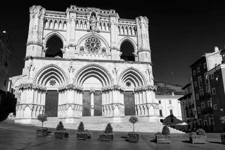 Cuenca (Castilla-La Mancha, Spain), facade of the medieval cathedral, in gothic style. Black and white