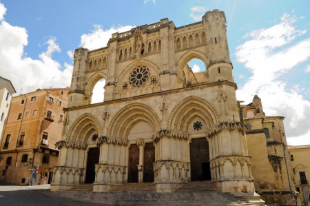 Front view of the facade of the medieval cathedral in gothic style at Cuenca in Castilla La Mancha, Spain.