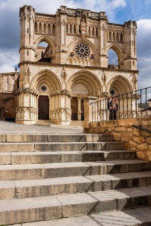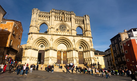 Cuenca, Spain - April 11, 2022: Stone building in gothic style, main facade. Cathedral of Cuenca. Spain