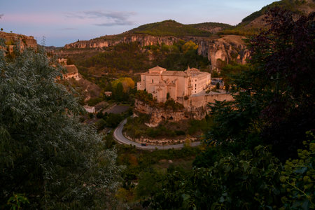 CUENCA, SPAIN - MARCH 29, 2015: Panoramic view of the Huecar Gorge with the town of Cuenca, Spain. In the foreground, the former Convent of San Pablo, since 1993 it houses a state-owned Parador hotel