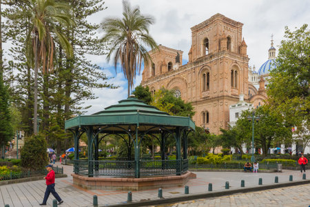 Cuenca Ecuador May 2018 inhabitants and tourists stroll in this park located in the center of the city called Calderon to also admire the cathedral