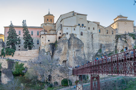 CUENCA, SPAIN - MARCH 28, 2015: People crossing the San Pablo Bridge, an iron and wood beam bridge spanning the Huecar River in Cuenca, Spain, opened in 1903