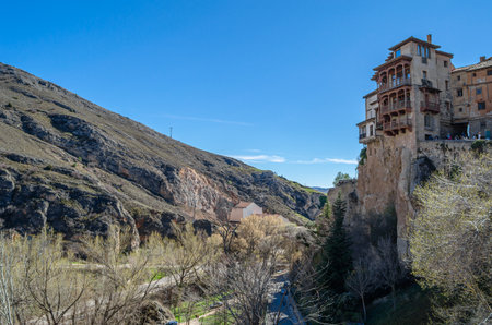 CUENCA, SPAIN - MARCH 28, 2015: The Hanging Houses (Spanish: Casas Colgadas) in Cuenca, Spain. They are so named because part of them has a corbelled roof, or large balconies, jutting out from the high rocky ledge of the Huecar River gorge. The only three