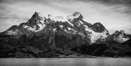 Mountain peaks of Torres del Paine in Patagonia National Park Chile in black and white, with a lake in the foreground.