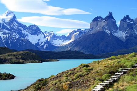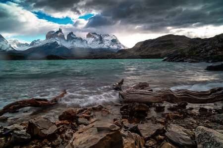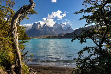 Travel to Chile. Picturesque lake Pehoe in the Patagonian Andes. The famous snow-capped cliffs of Los Cuernos by the lake. The lake with bright azure water from melting glaciers.