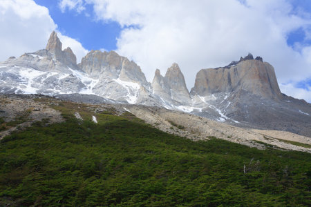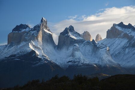 Beautiful landscape of the snowy peaks of mountains, Torres del Paine National Park, Chile