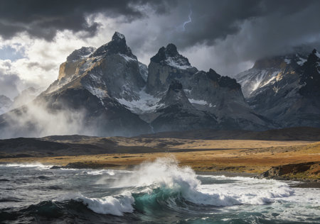 A breathtaking view of towering, snow-covered mountains set against a moody sky in Torres del Paine National Park, showcasing nature's grandeur and beauty.