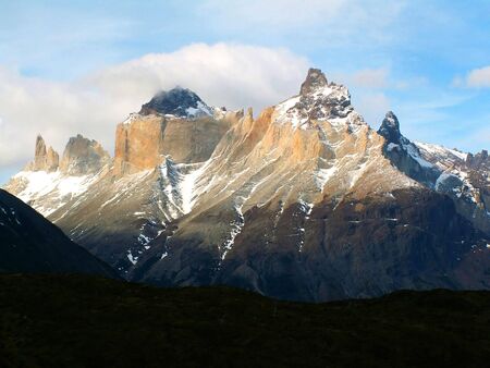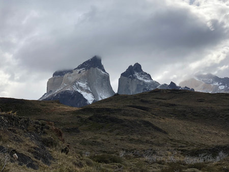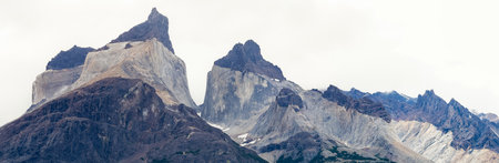 Epic beauty of the landscape - the National Park Torres del Paine in southern Chile. Cliffs of Los Kuernos in cold windy summer day