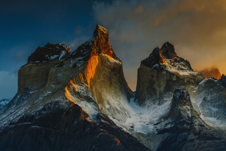 Cuernos, Horns of torres del paine covered with snow at torres del paine national park in the Andes of southern Chile in south America with dramatic clouds in the sky_5