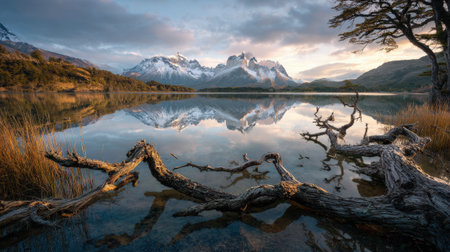 a wide angle view of lake pehoe and the paine massif from a lookout on a autumn sunrise at torres del paine national park in patagonia, chile