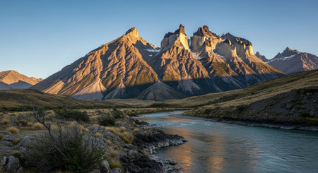 View of Torres Mountains in the Torres del Peine National Park during sunrise. Autumn in Patagonia, the Chilean side