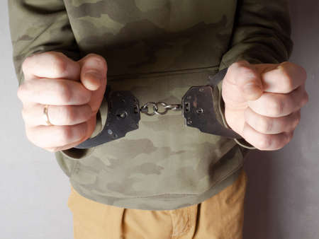 Arrested criminal man with handcuffs behind.Hands in handcuffs