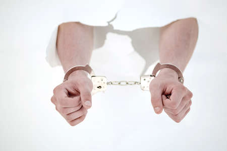 two hands with tight fists on handcuff reaching out on white background, room for copyspace