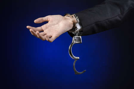 Corruption and bribery theme: businessman in a black suit with handcuffs on his hands on a dark blue background isolated