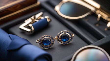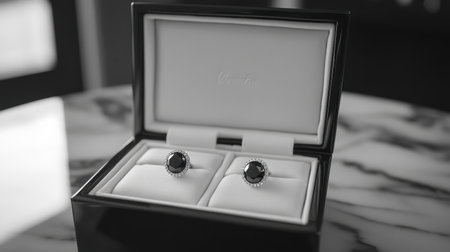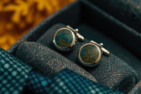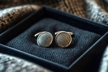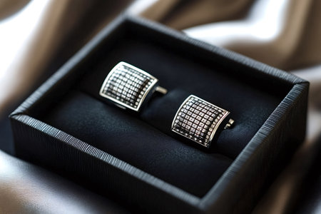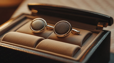 Pair of stylish cufflinks sits in a luxurious box, ready to complete a sophisticated look for a formal event, showcasing attention to detail and refined taste
